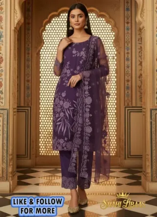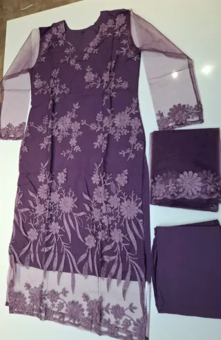 Elegante completo indiano composto da tre pezzi, perfetto per occasioni speciali. - Tessuto in seta viola con ricami dorati. - Dettagli con perline bianche e paillettes. - Maniche lunghe ricamate. - Orlo inferiore decorato con ricami e perline.