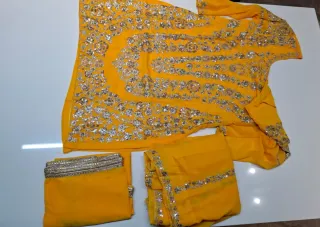 Bellissimo abito etnico indiano, perfetto per occasioni speciali. Il tessuto leggero e la lavorazione artigianale lo rendono unico. - Dettagli ricamati con filo dorato e paillettes. - Maniche corte con bordi decorati. - Orlo inferiore con ricami elaborati e frange. - Piccoli accenti di colore arancione sui ricami.