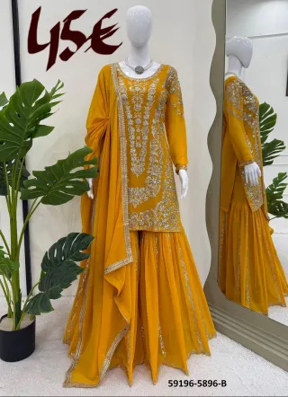Elegante completo indiano composto da tre pezzi, perfetto per occasioni speciali. - Tessuto in rete con ricami floreali. - Maniche lunghe in rete. - Pantalone abbinato.