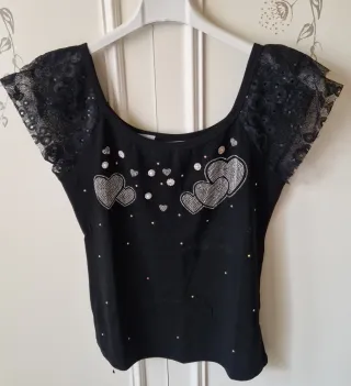 Maglietta da donna con un design unico e dettagli scintillanti. Cotone elastico Lunghezza cm 58 da ascella ad ascella cm 44 larghezza spalle cm 42 - Maniche corte in pizzo nero. - Decorazione frontale con cuori tempestati di strass. - Piccoli strass e perline sparse sul davanti.