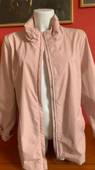 Giacca leggera con un design moderno. - Chiusura con zip frontale. - Collo alto con coulisse. - Polsini con fantasia a pois.colore rosa antico tg 41F =tg 48 italiana ma x misure precise vedi foto in cm