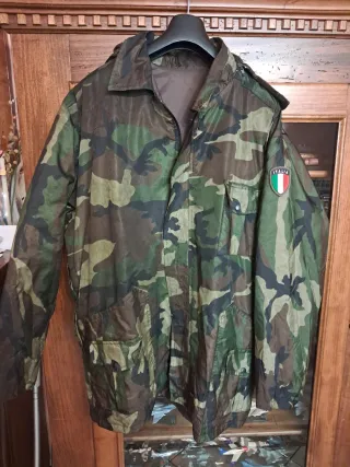 Giubbino militare impermeabile con stampa mimetica. - Patch bandiera italiana sul braccio. - Tasche frontali. - Cappuccio.