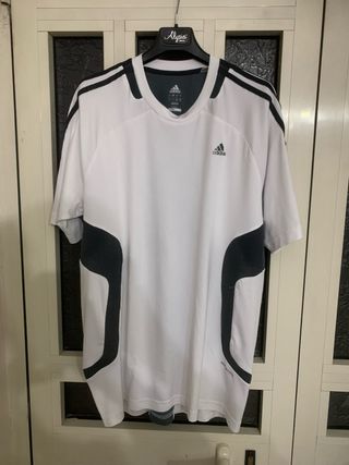Maglietta sportiva Adidas a maniche corte. - Colore bianco con inserti neri. - Logo Adidas sul petto. - Inserti in mesh sui fianchi. - Tecnologia ClimaCool per la traspirazione.