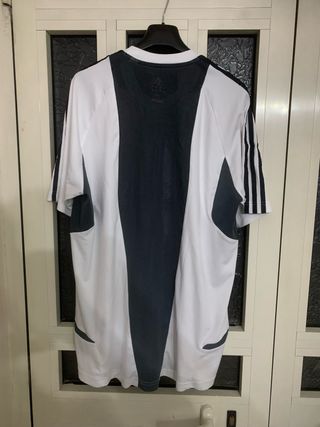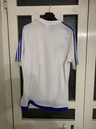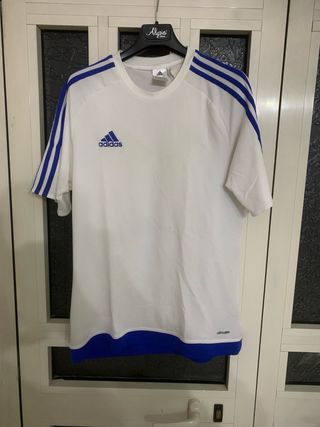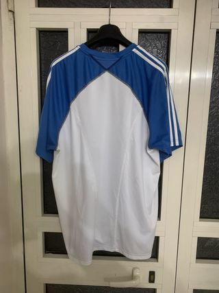 Maglietta sportiva Adidas a maniche corte. - Logo Adidas sul petto. - Strisce Adidas sulle maniche. - Inserti blu sul fondo.