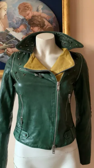 Giubbetto in pelle vintage Le Sentier. Un capo unico con un design audace. - Dettagli borchie sul colletto e sulle maniche. - Zip frontale asimmetrica. - Tasche con zip. - Fodera interna a contrasto.