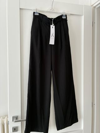 Pantaloni eleganti a gamba ampia. - Vita alta con passanti per cintura. - Tasche laterali. - Chiusura con zip e bottone.