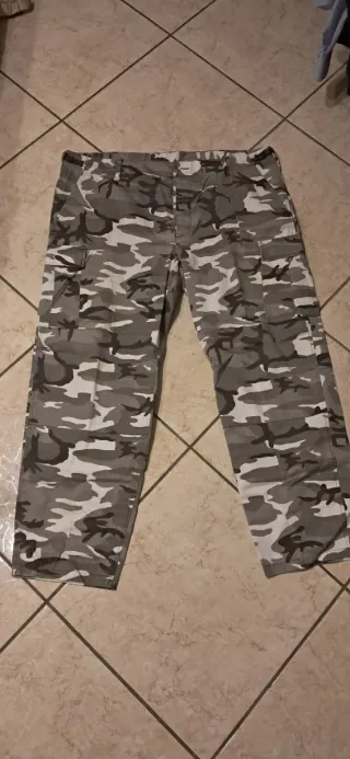 Pantaloni cargo con fantasia mimetica vita 60cm lunghezza 110cm - Tasche laterali. - Chiusura con zip e bottone. - Passanti per cintura.