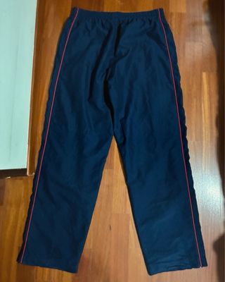 Pantalone sportivo Adidas in tessuto blu. Un po’ scolorita - Design con le classiche tre strisce bianche sui lati. - Vita elasticizzata con laccetti regolabili. - Tasche laterali. - Fondo gamba elasticizzato.