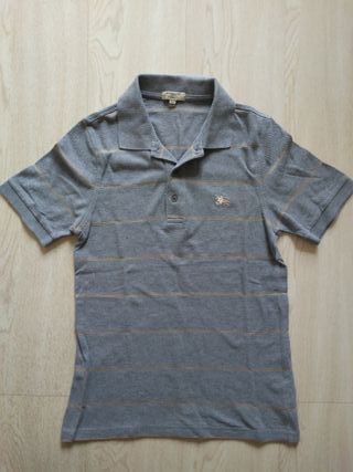 Polo Burberry in cotone, mai indossata. - Fantasia a righe sottili. - Logo ricamato sul petto. - Chiusura con bottoni.