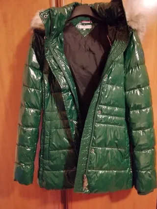 Piumino Tommy Hilfiger con finitura lucida e cappuccio bordato in pelliccia sintetica. - Chiusura zip frontale. - Tasche laterali con zip. - Polsini elasticizzati.