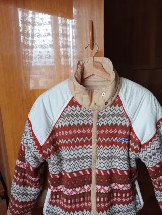 Giubbotto pazzesco anni 80. Double face: lato a in tessuto misto cotone e lato b in maglia jacquard di lana (vedi etichetta). Condizioni generali ottime/eccellenti. Difetti: lievissimo ingiallimento alla spalla e due micro forellini sul retro. Tutto visibile nelle ultime foto. Taglia S/M da uomo. Made in Italy. Sportime by Bassetti.