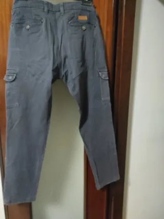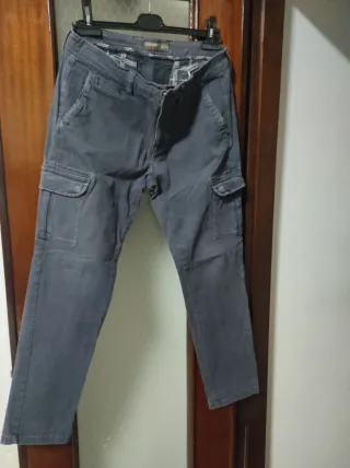 Pantaloni cargo di colore grigio, taglia 48. - Tasche laterali con patta. - Chiusura con zip e bottone. - Tessuto resistente.