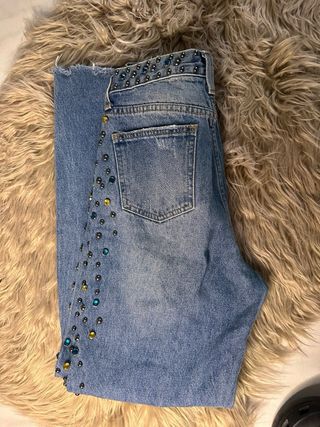 Jeans ZUIKI decorati con strass colorati e dettagli strappati. - Vita alta. - Chiusura con zip e bottone. - Tasche anteriori e posteriori. - Applicazioni di strass su tutta la superficie. - Orlo sfrangiato.