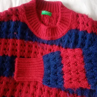 Maglione Benetton a righe rosse e blu, realizzato in misto lana. Un capo comodo e versatile. - Design a righe orizzontali. - Texture lavorata a maglia. - Scollo rotondo.