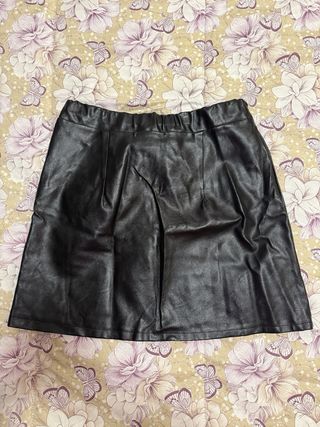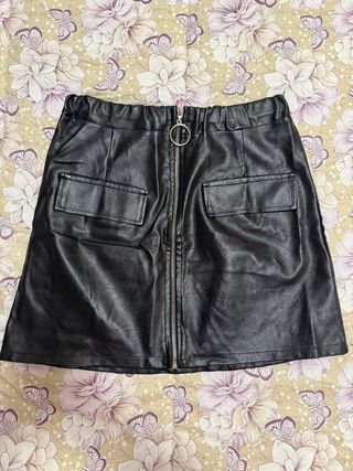 Gonna corta in ecopelle nera, perfetta per un look audace. - Chiusura frontale con zip e anello. - Due tasche applicate sul davanti. - Vita elasticizzata per un comfort ottimale.