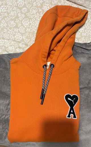 Felpa con cappuccio Ami Paris x Puma. - Colore arancione vivace. - Logo a forma di cuore con Puma e A ricamato sul petto. - Coulisse con cordini a contrasto.