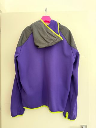 Giacca sportiva Nike con cappuccio. - Tessuto in pile. - Zip frontale. - Logo Nike sul petto. - Inserti grigi con texture. - Dettagli in contrasto fluo. - Iniziali GZ