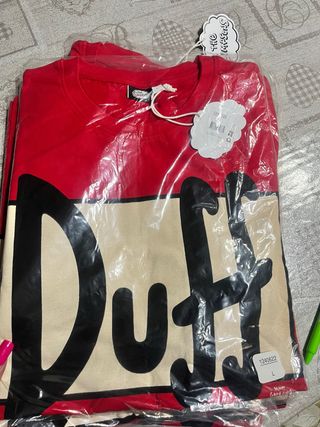 Maglietta rossa con stampa Duff dei Simpson. - Stampa frontale Duff. - Colore rosso vivace. - Design iconico.