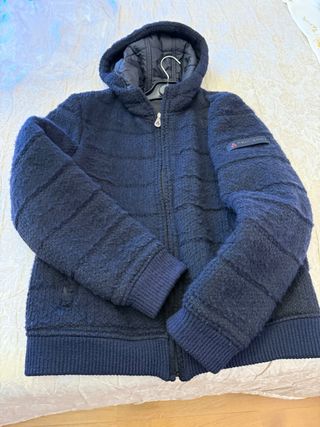 Giubbotto Peuterey con zip e cappuccio. - Tessuto esterno in lana - Fodera interna imbottita. - Polsini e fondo a costine. Lunghezza cm 62, da spalla a spalla cm 50 E’ stato indossato ma le condizioni sono buone. Quelle interne sono eccellenti come nuove, quelle esterne fisiologicamente piu consumate con presenza di “pallini” dovuti dal tempo. Lana 60 % Polietere 40%