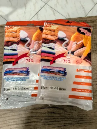 Set di 2 sacchi sottovuoto per conservare al meglio abbigliamento e biancheria. - Riducono il volume fino al 75%. - Proteggono da polvere, umidità e insetti. - Dimensioni: 68x98 cm. - Ideali per riorganizzare armadi e valigie.