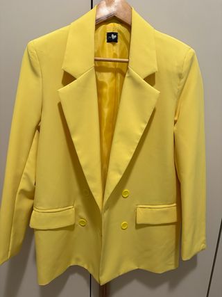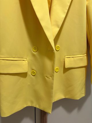 Giacca elegante dal colore giallo vivace, perfetta per aggiungere un tocco di stile. - Design con spalline. - Fodera interna lucida. - Chiusura doppiopetto con bottoni. - Tasche frontali con patta.