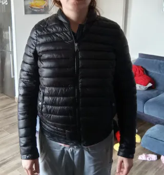 Piumino nero lucido con zip centrale e tasche laterali. Taglia 40-42