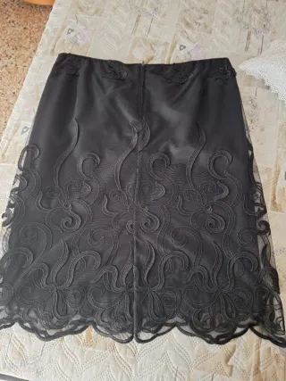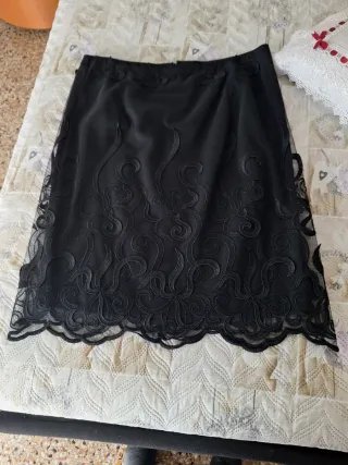 Elegante gonna nera con un raffinato ricamo in pizzo che decora il fondo. - Tessuto in pizzo trasparente con motivi floreali. - Orlo ondulato e decorato.