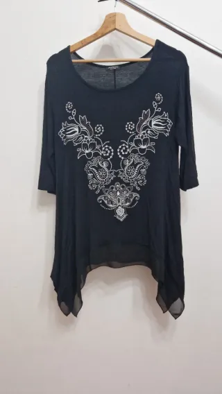 Maglia da donna con un design floreale ricamato sul davanti. Il modello ha una vestibilità comoda e un bordo in tessuto leggermente trasparente. - Maniche a tre quarti. - Scollo rotondo. - Dettagli ricamati e perline.