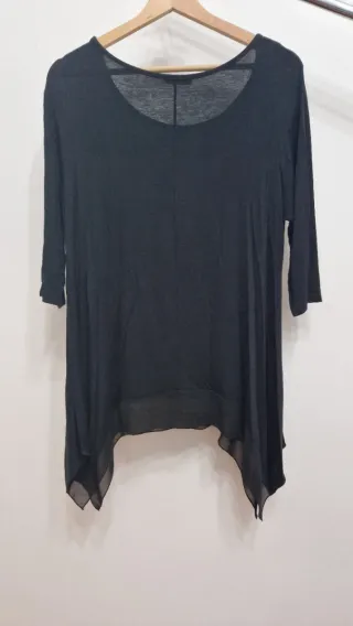Top nero con manica a tre quarti. - Scollo morbido. - Elastico in vita. - Tessuto leggero.