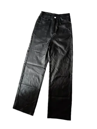 Pantaloni in ecopelle neri a taglio dritto. - Vita alta. - Chiusura con bottone e zip. - Tasche. - Effetto lucido. Nuovo mai messo.