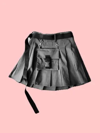 Gonna corta plissettata con cintura e dettagli cargo. - Tessuto impermeabile. - Tasca frontale con fibbia. - Cintura con passanti e anelli a D. - Laccio laterale regolabile.