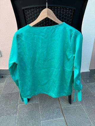 Maglietta elegante con un tocco di stile. - Maniche lunghe con fiocchi ai polsi. - Scollo a V con dettaglio plissé centrale. - Tessuto leggero e fluido. Misure 56x36x46