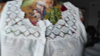 Elegante camicia da donna in tessuto lucido. Presenta dettagli arricciati sul collo e sui polsini, con un volant sul fondo. Ricamo a mano - Scollo a V con laccetti. - Maniche lunghe. - Tessuto liscio e brillante.
