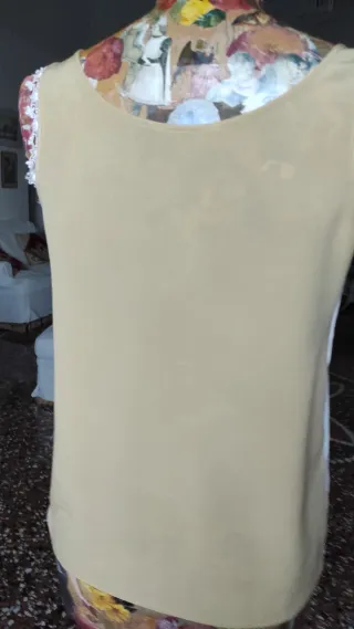 Canotta color beige con un'elegante applicazione in pizzo bianco sul décolleté. Il pizzo crea un motivo floreale decorativo che scende verso il centro. - Dettaglio in pizzo bianco. - Design senza maniche.