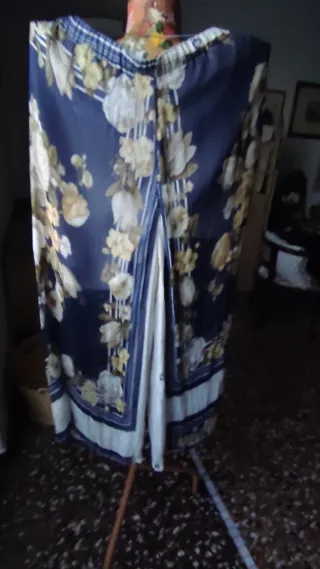 Pantaloni con una vivace fantasia floreale.vita cm 80 con elastico - Tessuto leggero e fluido. - Design con fiori su fondo blu. - Dettagli a righe bianche e blu.