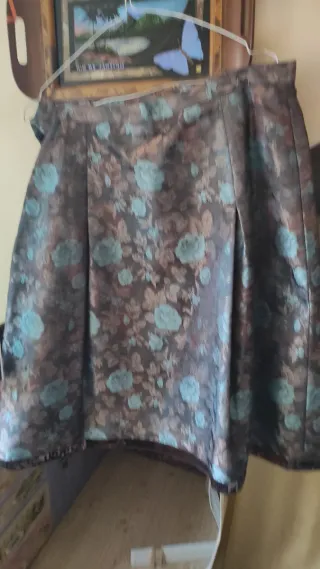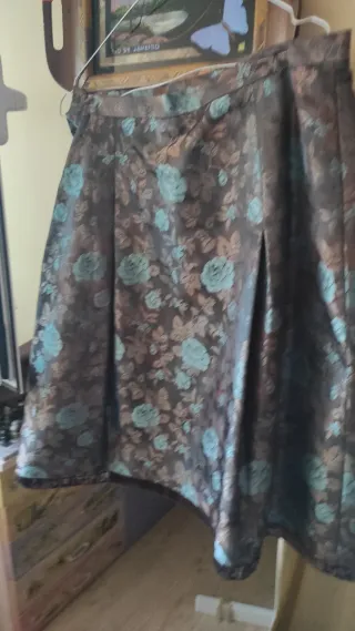 Gonna con fantasia floreale. Il tessuto broccato dona un tocco di eleganza. - Fantasia floreale con rose. - Tessuto broccato lucido.