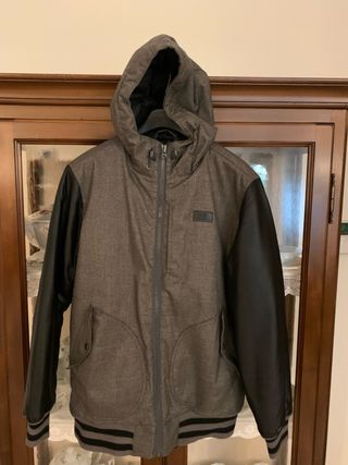 Giubbotto Vans con cappuccio, perfetto per un look casual. - Maniche in ecopelle. - Tessuto principale grigio mélange. - Polsini e fondo a costine. - Chiusura con zip frontale. - Tasche laterali con patta.