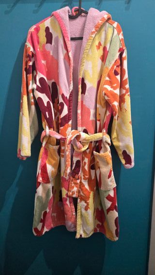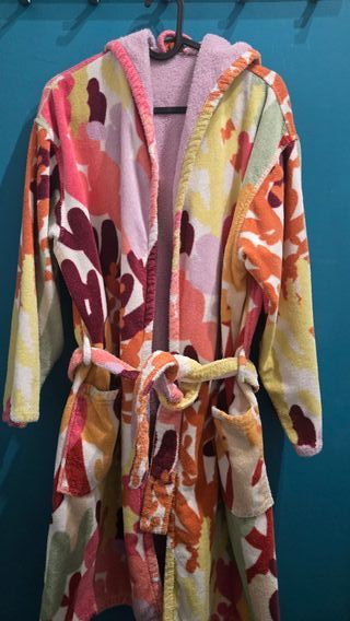 Accappatoio da donna in spugna di cotone con cappuccio e cintura in vita. Taglia M, originale Missoni. Si presenta ancora molto morbido nonostante i lavaggi. Nessun difetto evidente o filo tirato.