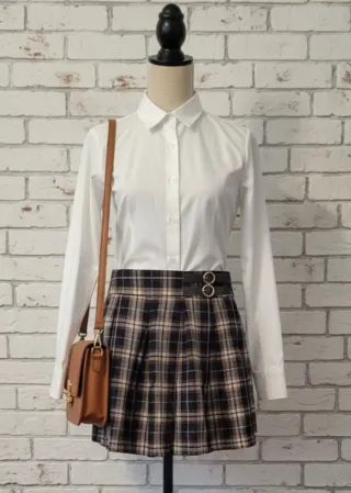 Elegante completo Parisian Style composto da camicia e gonna. - Camicia a righe con dettagli neri. - Gonna a fantasia tweed.