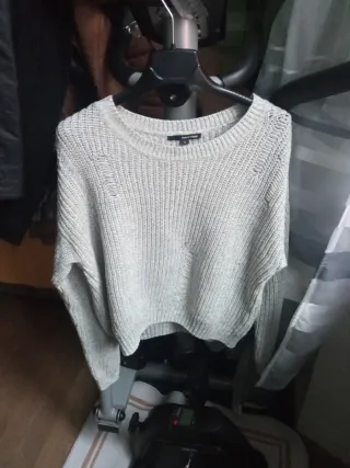 Maglioncino grigio con un design moderno e dettagli strappati. - Maniche lunghe. - Scollo rotondo. - Vestibilità corta.