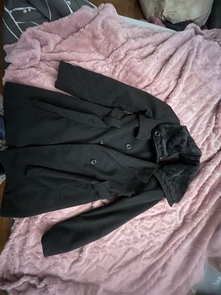 Elegante cappotto da donna con un raffinato collo in pelliccia. - Chiusura doppiopetto con bottoni. - Cintura in vita per definire la silhouette. - Tasche laterali. - Dettagli con pelliccia sintetica sul colletto.