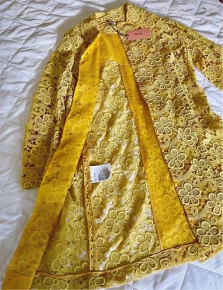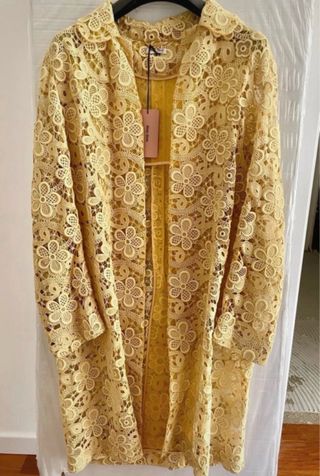 Elegante soprabito MIU MIU (originale) in pizzo giallo cedro con un delicato motivo floreale. Un capo unico per aggiungere un tocco di raffinatezza. È nuovo ancora con cartellino. Fodera in seta. Lavorazione straordinaria. Davvero molto bello ed elegante. Taglia 42 italiana (ma indossabile anche da una 44). Visto dal vivo è ancora più bello. Le foto non rendono…. - Motivo floreale all-over. - Design aperto. - Maniche lunghe.