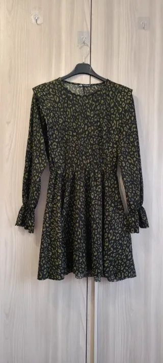 Vestito corto ZARA con stampa animalier. - Maniche lunghe con polsini a campana. - Vita elasticizzata. - Dettaglio volant sulle spalle.