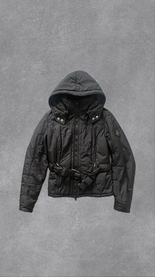 Giubbotto Refrigue in stile bomber, un capo dal fascino vintage. Misure: spalle circa 43cm, altezza circa 72cm In ottimo stato, solo in alcuni punti il colore è leggermente sbiadito, ma nulla di particolarmente evidente. Ha il cappuccio che si può togliere e mettere con cerniera. - Design con collo alto. - Chiusura frontale con zip e bottoni. - Tasche applicate sul davanti.