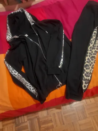 Completo tuta da donna composto da felpa con zip e pantaloni. - Felpa con cappuccio e zip frontale. Cotone - Dettagli con stampa leopardata sui lati. - Pantaloni con elastico in vita. No tasche nei pantaloni e nella felpa