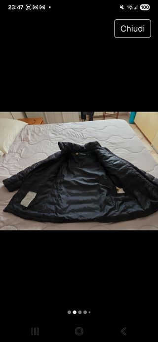 Piumino Ciesse originale, imbottito in vera piuma d'oca con cappuccio, tenuto molto bene in quanto poco utilizzato. Lunghezza alla coscia (73 cm circa). Colore nero, taglia 44, modello "dritto". Il capo è stato lavato in tintoria prima di essere venduto. - Modello con cappuccio. - Chiusura centrale con zip. - Tasche laterali.