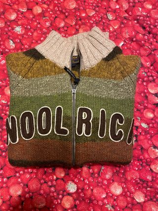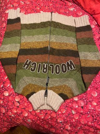 Maglione Woolrich con zip e collo alto, perfetto per l'inverno. - Design a righe orizzontali. - Logo Woolrich sul davanti. - Materiale caldo e confortevole. - Lana e alpaca!
