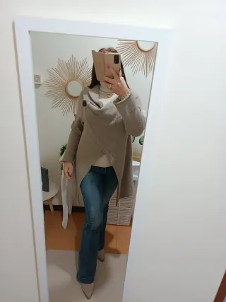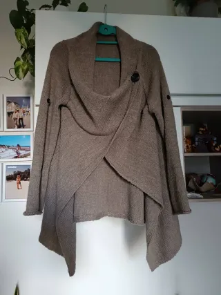 Soprabito a mantella con maniche lunghe con un design asimmetrico e il colletto ampio - Colore beige con dettagli marroni. - Design asimmetrico con chiusura a bottone. - Chiusura con bottone. - Bottoni sulle maniche per accorciare