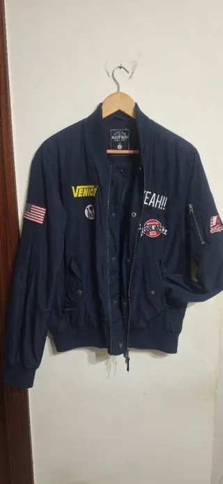 Giubbino stile bomber blu con diverse patch decorative, tg L in ottime condizioni Tasche frontali con zip e bottoni a pressione.
