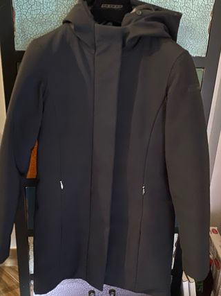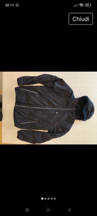 Giacca impermeabile blu marino made in Italy. Davanti ha due tasche. Il collo può essere un po' alzato. Le spalle misurano 46 cm. Il giacchetto è lungo 85 cm. In perfette condizioni, ma il laccetto del collo è un po' rovinato.